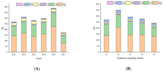 RI of HMs in different years (A) and Eir of HMs in different stations (B).