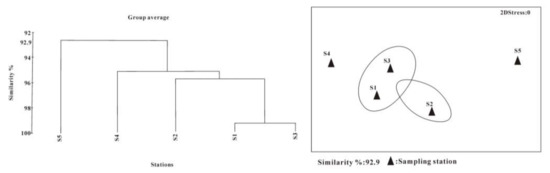 The abundance of taxa, individual density of benthos, and diversity of the benthic fauna are shown in Figure 7. There was little difference in the abundance of taxa, density, and diversity between the central area (S3) and the northwest area (S1 and S2). The abundance of taxa and density of S4 in the southeast corner of the dumping area was low, and those of S5 located to the south of the dumping area were significantly higher than those at the other stations. The response of benthic communities to cumulative dumping was analyzed based on the abundance of taxa, density, and diversity of each station in the dumping area. The abundance of taxa, density, and diversity of benthos at each station were transformed by logarithmic conversion to create a Bray–Curtis similarity matrix and to conduct clustering and MDS sequencing. The results are presented in Figure 8. The benthic fauna community in the study area was divided into four groups at a similar level of 92.9%. S1 and S3 belong to group 1, in the central area and to the northern part of the dumping area. S2 belongs to group 2, in the northwest corner of the dumping area. Groups 1 and 2 had a high similarity. S4 belongs to group 3, in the southeast corner of the dumping area. S5 belongs to group 4, outside the dumping area. Stations in groups 1 and 2 were the areas with the largest dumping amount and higher ecological risk. Stations in groups 3 and 4 were the areas with less dumping amount than group 1 and 2, and pollution and ecological risk were also lower. The temporal and spatial distribution characteristics of benthic communities were highly related to the pollution levels in different dumping areas.