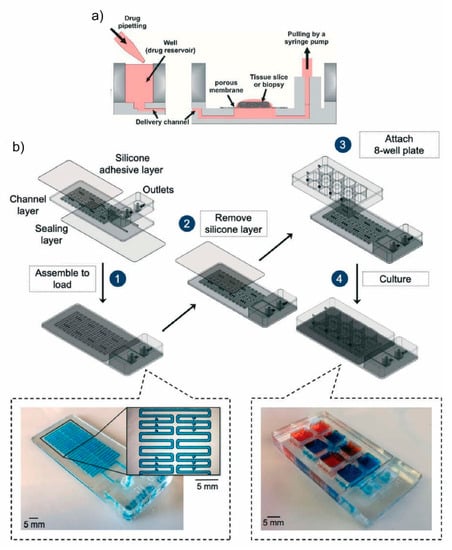 Chang et al. demonstrated a microfluidic device to study the response of live slice cultures to a range of drug doses in parallel [52]. They confirmed the viability of both the organotypic and GBM xenograft mouse brain slice cultures prior to starting chemotoxicity tests. This PDMS device includes 80 inlet wells connected to downstream microchannels acting as a concentration source or sink. Sources deliver the medium while sinks prevent lateral spread between channels. The delivery channels act as a source, and their adjacent channels act as concentration sinks that prevent lateral spread between delivery channels. A prescribed concentration profile is transported to the tissue slice through the PTFE porous membrane (Figure 2a). Later, Rodrigues et al. manufactured a thermoplastic version of this platform made in PMMA which features less drug absorption. This platform consists of a 40-well plate with an integrated channel network layer for multiplexed drug testing onto GBM xenografts and patient-derived colorectal cancer tumor slices [53].