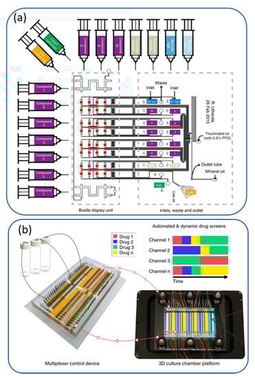 Combinatorial drug screening using (a) a plug-based microfluidic device using braille valves designed on pancreatic cancer biopsies. Reproduced with permission from Ref. [56] under an open access Creative Common CC BY license. (b) a programmable membrane-valve-based microfluidic chip with PDMS-based 3D culture chamber. Reproduced with permission from Ref. [57] under an open access Creative Common CC BY license.
