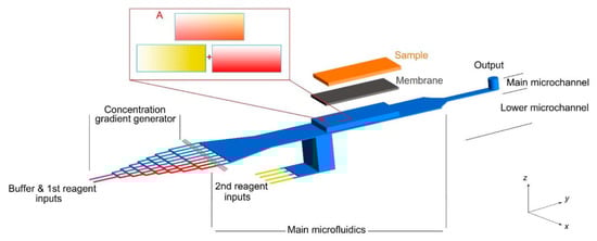 In the context of personalized medicine, the microfluidic devices should be compatible with patient-derived samples. According to the limitation of current microfluidic platforms, there is a lack of combinatorial drug screening on macroscale samples, e.g., a patient’s tissue sample obtained through surgical biopsy. A continuous gradient is generated on a macroscale sample in a few of the current microfluidic devices. In this way, the recent microfluidic device developed by Rismanian et al. [76], with the capability of delivering two different reagents simultaneously on a microdissected tissue sample, is a promising platform as shown in Figure 4. Utilizing the presented microfluidic device, continuous linear gradients of two reagents could be generated along with the two different directions on a millimeter-sized sample (sample length and width). So, all possible combinations of two drugs would be distributed on the sample surface. Future works could focus on drug screening on the cancer tissue samples loaded in this microfluidic device.