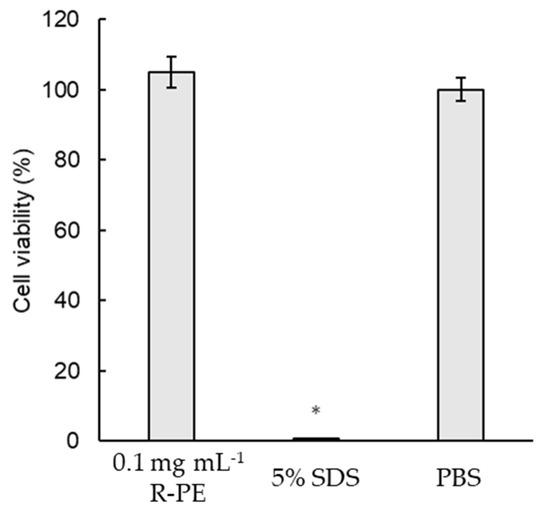 Cell viability of NIH-3T3 cells treated to different concentrations of R-phycoerythrin (R-PE) purified from Colaconema formosanum. Data are shown as the mean ± standard deviation (n = 5). Significant differences from the control group were denoted by asterisks (paired sample t-test, p < 0.05).