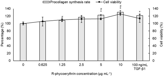 Concentration-dependent promotion of type-I procollagen synthesis rate and cell viability of Hs68 cells by R-phycoerythrin purified from Colaconema formosanum. TGF-β1 stands for transforming growth factor-β1. Data are shown as the mean ± standard deviation (n = 5). For procollagen synthesis rate and cell viability rate, significant differences from the control group were denoted by asterisks and number signs, respectively (paired sample t-test, p < 0.05).