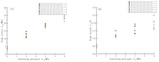 (a) Peak stress of different confining pressures under the same number of freeze-thaw cycles. (b) Peak strain of different confining pressures under the same number of freeze-thaw cycles.