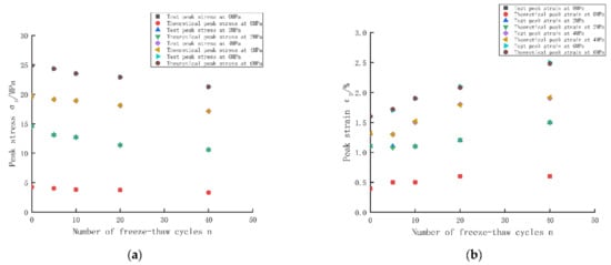 (2) The peak strain at the peak point of the theoretical curve of the damage constitutive model established in this paper does not change much with the number of freeze-thaw cycles, and the peak stress will fluctuate slightly with the number of freeze-thaw cycles. Generally speaking, with the change of the number of freeze-thaw cycles, the peak point of the theoretical curve and the peak point of the experimental data curve are in suitable agreement.