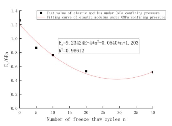 Fitting curve of elastic modulus under different freeze-thaw cycles under confining pressure of 0 MPa.