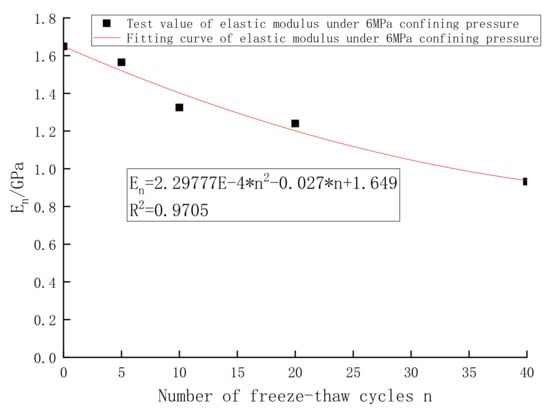 Fitting curve of elastic modulus under different freeze-thaw cycles under confining pressure of 6 MPa.