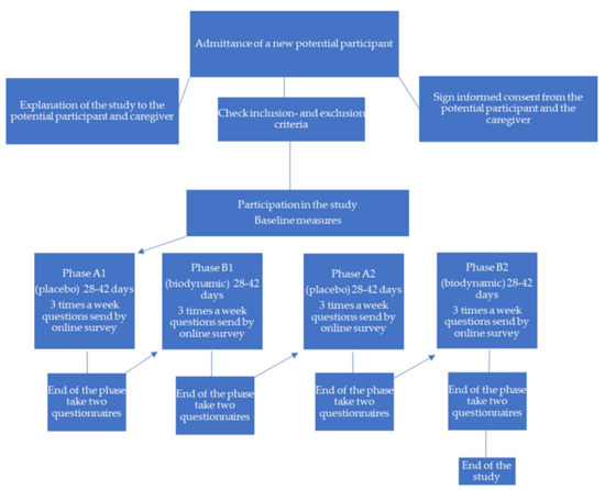 Placebo light provided by the light system was chosen, instead of the ‘normal’ lights of the participant, in order to blind the participants as much as possible to the difference in conditions. The length of the phases was randomly assigned for each subject separately so that the internal validity of the research would be increased [37]. The literature shows it takes about two weeks to adjust the biological clock in people with dementia [38]. Therefore, we have deliberately chosen to extend the phases by 14–28 days. Each phase lasted between 28 and 42 days. Before the study started, the length of each phase was randomly determined using the Research Randomizer programme provided by the Social Psychology Network (http://randomizer.org, accessed on 20 July 2021) [39].