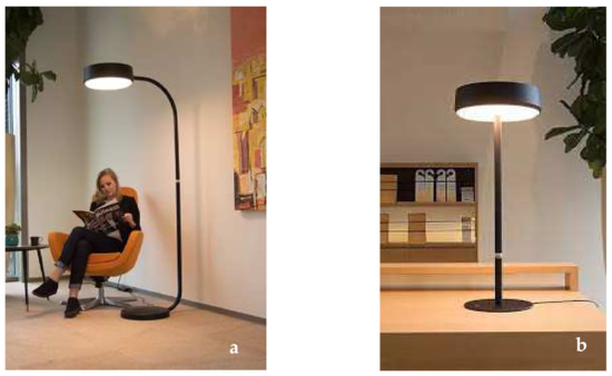The Biodynamic Light System Sparckel, types ‘Bright Brenda’ and ‘Jolly James’ (Figure 2a,b), are BDL systems that can be used in a home situation and have been developed after extensive research in a co-production with lighting specialists and end-users [24]. The Bright Brenda and the Jolly James have the same optical characteristics.
