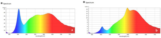 The intervention in this study is BDL. A fixed day curve programme for BDL was installed and used in our study. One lamp produces 1000–7500 lumen, five times more than is usual in a living room. The spectrum of the BDL simulates a regular daylight curve by following this curve in light colour and intensity. In the morning, the light system produces direct and indirect light with a high illuminance and bluish colour. In the evening, the light has lower levels of illuminance (more red in colour) [24]. The topside of the lamp produces indirect light and contains 12 high power LED lights producing a maximum of 3 W per piece. It consists of four lights producing 6500 K, four lights producing 2700 K and four lights producing 1800 K. The bottom side produces direct light and contains 196 medium power LED lights producing a maximum of 3 W per piece. It consists of 98 lights producing 6500 K, 49 lights producing 2700 K and 49 lights producing 1800 K. The correlated-colour temperature (CCT) is 4600 K. The varying colour temperature during the day of the biodynamic lighting lamp is shown in Figure 3 [24], and spectrum analyses are shown in Figure 4a,b. Other important data from the measurement report [48] are shown in Table 2 [24].