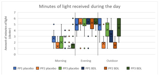 Boxplots of minutes of light received in the morning, evening and outdoor. The median is demonstrated as the ‘X’ within the boxplot. The length of the boxplot represents the interquartile range, and the boxplot whiskers are 1.5 times the interquartile range. All data points outside the whiskers are considered outliers. (Cluster 1 = 0–30 min light per day; cluster 2 = 30–60 min light per day; cluster 3 = 60–90 min light per day; cluster 4 = 90–120 min light per day; cluster 5 = 120–150 min light per day; cluster 6 ≥ 150 min light per day). Randomisation tests showed no significant difference between morning, evening and outside (p > 0.05).