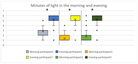 Measurements of light minutes during the morning and evening were taken for all three participants, see Figure 6. The number of minutes of light received in all phases from the light system in the morning (9 a.m.–12 p.m.) was significantly less than the number of minutes of light received from the light system in the evening (7–11 p.m.) for all three participants (Figure 5). Participant 1 had an average of 30–60 min light in the morning, and participants 2 and 3 had an average of 0–30 min light in the morning. In the evening, the average minutes of light from the light system was 120–150 min for all three participants. This means that for the intervention phases, each participant received in total more amber/red light with a low intensity than blueish/white light with a high intensity.