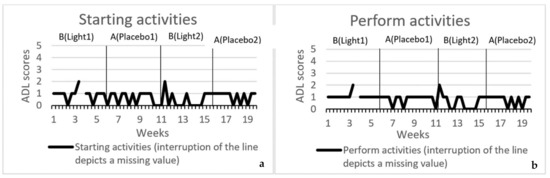 This study aimed to explore whether participants improved in their ADL in the intervention condition (BDL) compared to in the placebo condition (placebo light). Data were collected from a minimum of 12 time points to a maximum of 18 time points per phase.