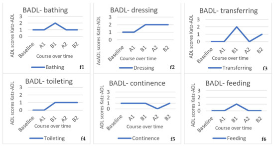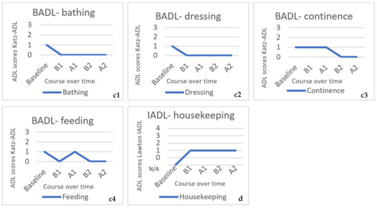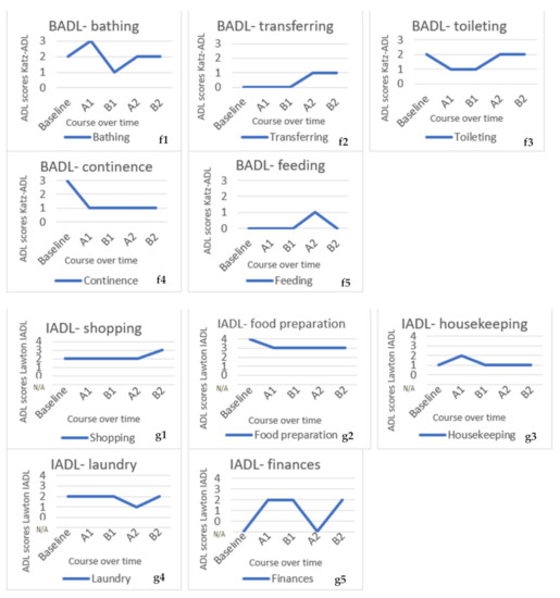 For participant three, the course of ADL, measured with the Katz-ADL and Lawton IADL, is seen in Figure 9f1–f5,g1–g5. ADL scores that were completely stable over time (dressing, using telephone, transportation and medication) are not shown in the graphs. In BADL, there was an erratic course, but none of the BADL increased over time and some even decreased, e.g., feeding was decreased to ‘completely independent’. In IADL, a more stable pattern could be seen with even some decrease (for example, food preparation).