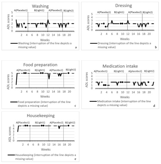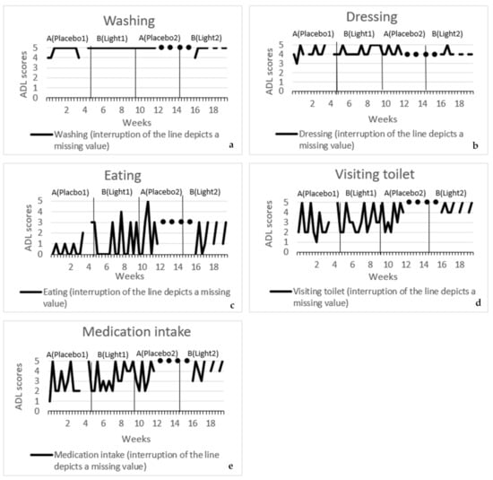 In participant three, whether there is a difference in ADL between the intervention phases and the placebo phases due to BDL was also determined. Figure 9a–e shows the course of ADL over time per phase. ADL in participant three were classified as washing, dressing, eating and visiting the toilet (BADL) and medication intake (IADL). Statistical analyses indicated that none of the activities of daily living in participant three were significantly decreased by biodynamic light: washing p = 0.59; dressing p = 0.33; eating p = 0.55; visiting the toilet p = 0.49; medication intake p = 0.49.