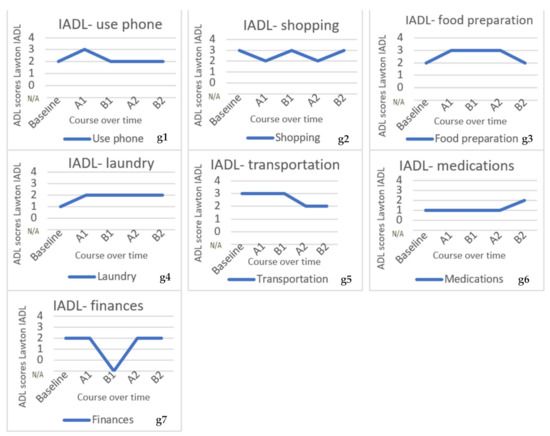 (a) Scores washing; (b) Scores dressing; (c) Scores eating; (d) Scores visiting toilet; (e) Scores medication intake; (f1–f5) Scores Katz-ADL; Baseline = before start of the first phase; B1 = scores at the end of intervention phase one; A1 = scores at the end of placebo phase one; B2 = scores at the end of intervention phase two; A2 = scores at the end of placebo phase two; (g1–g5) Scores Lawton IADL; Baseline = before start of the first phase; B1 = scores at the end of intervention phase one; A1 = scores at the end of placebo phase one; B2 = scores at the end of intervention phase two; A2 = scores at the end of placebo phase two.
