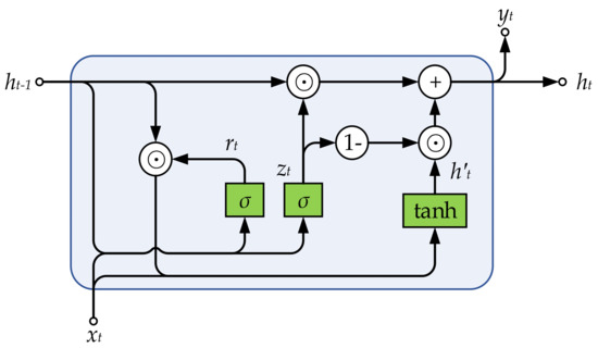 Similar to the LSTM neural network, the gated recurrent unit (GRU) neural network is also a variant of recurrent neural networks [38], and it has fewer parameters because there is no output gate. The cell structure of GRU is shown in Figure 3, and the procedure on updating the cell state and calculating the output of GRU can be expressed as