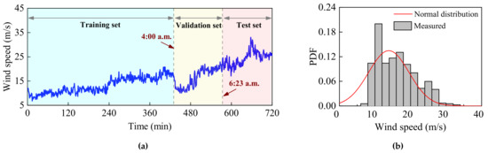 Measured wind speed data. (a) Peak wind speed in a 1 min time interval; (b) PDF of measured wind speeds.