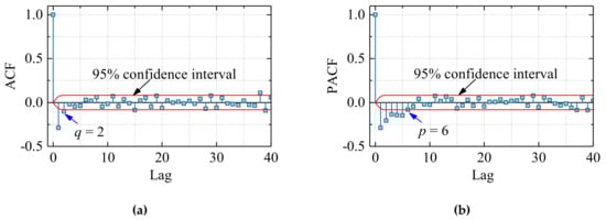 Figure 6 depicts the ACF and PACF of the differenced data. A 95%-confidence interval, in which the wind speeds are thought to be uncorrelated, is also plotted. It is observed that the ACF has a cutoff after the second lag, and the PACF cuts off after the sixth lag, which implies that the values of q and p in the time-series model can be taken as 2 and 6, respectively. Hence, an ARIMA(6,1,2) model can be utilized to characterize the selected dataset.