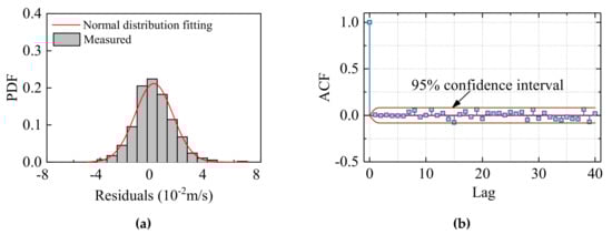 After the orders of different terms are determined, the remaining coefficients of the ARIMA model can be estimated via the maximum likelihood method. Then, the wind speeds of the training set are reconstructed via the established ARIMA(6,1,2) model and the residual errors with respect to the measured data are calculated. Figure 7a presents the PDF of the residual component, and the ACF of residual errors is depicted in Figure 7b. A comparison between the PDF of the residual component and the normal distribution indicates that the residual errors are Gaussian with a zero mean and standard deviation of 0.0141. The ACF suggests that there is no significant correlation between the errors and its own lagged values. Based on these observations, the established ARIMA(6,1,2) model provides a satisfied estimation of the training set.