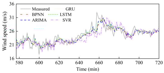 Based on the five models given in Table 2, one-step ahead forecasting is carried out for the wind data shown in Figure 4. The comparison of measured and forecasted wind speeds is presented in Figure 8. As observed in the figure, the forecasting results by the ARIMA, BPNN, LSTM, and GRU models have slight differences and can generally resemble the measured wind speeds. However, the SVR model presents noticeable deviations from the measured wind data at each instant, because the tacit assumption of Gaussian distribution to be required by SVR is not well satisfied for the measured winds. In addition, the peak wind speed of this extreme wind event is underestimated by all five models. This is probably attributed to the fact that these statistical methods based on the accumulated historical data are able to capture the primary trend of the time-series, but the abrupt changes around the peak wind speed of tropical-storm winds that present completely different patterns cannot be characterized. This point is thus proved to be a critical and difficult issue for the short-term forecasting of tropical storms using time-series models.