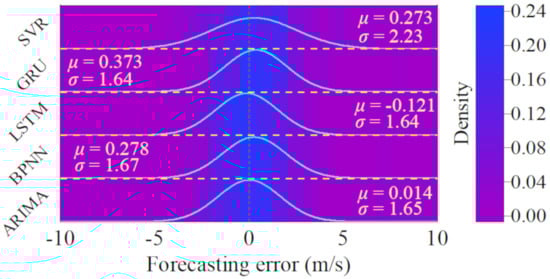 Figure 9 depicts the density heatmap of the forecasting errors with a comparison to the fitted normal distribution. It is observed that the errors of the ARIMA, BPNN, LSTM, and GRU models are generally satisfied with the normal distribution with small shifts from zero in the mean, especially for the results of the ARIMA and LSTM models. The ARIMA model has the smallest mean of 0.014, whereas the mean of the GRU model has reached 0.373. The error distribution of the SVR model is the flattest, which indicates the largest standard deviation. This observation is consistent with the aforementioned phenomenon that the SVR model provides the worst forecasting with large errors.