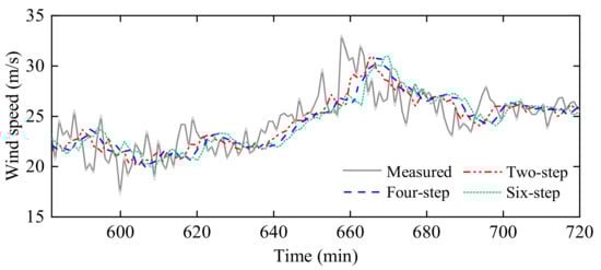 The emergency management hopes the forecasting can be as far ahead of time as possible. Hence, multi-step ahead forecasting is also appealing for tropical storms, although the error increases as the number of forecasting steps increases [49]. The difference between one-step and multi-step ahead forecasting is that more outputs are required in the model building of a multi-step case. Figure 10 shows a comparison of multi-step forecasted wind speeds by the ARIMA model with comparison with the measured data. The results support the fact that the deviations between forecasted and measured wind speeds become more and more prominent as the time horizon expands, as the correlation between the wind speeds in the more distant future and the historical data becomes weaker.