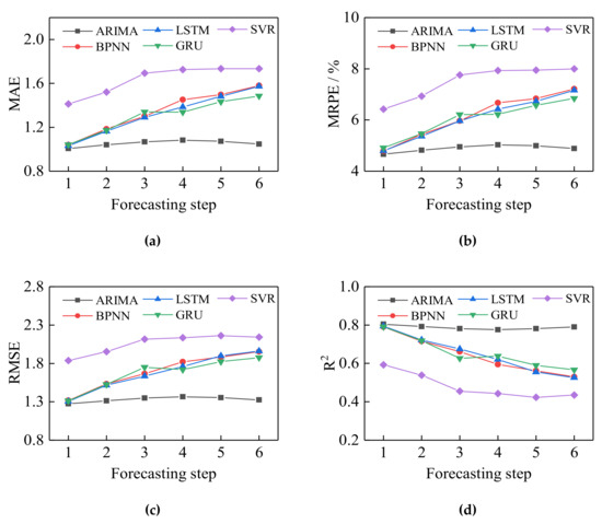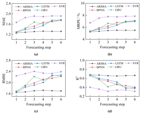 - The forecasting errors of different models all increase with the augment of forecasting steps, but the error increment of the ARIMA model is the smallest. The SVR model still provides the worst prediction at different forecasting steps, and the difference in the errors of the BPNN, LSTM, and GRU models is small.