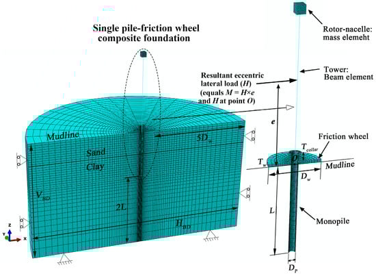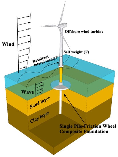 Large diameter monopile is often applied to support offshore structures such as wind turbines (OWTs) [1,2,3,4]. This is because of its sufficient theoretical basis for analysis design and mature manufacturing technology. However, the bearing capacities provided by monopiles are likely to not be suitable for the next generation of larger wind turbines in more severe environments [5,6,7,8,9]. For example, for OWTs with a full capacity of more than 10 MW, it would be costly and bring more challenges for the construction and installation procedure by merely increasing the diameter and embedment length of the monopile. Thus, a new type of single pile-friction wheel composite foundation has therefore been proposed, which combines the monopile and circular footing foundations. Compared to the traditional monopile foundation, this composite foundation provides higher bearing capacity and stiffness with less construction time and expense [10,11,12], as is shown in Figure 1. This composite foundation is initiated from the concept of pile caps and embedded retaining walls with stabilizing platforms, in which the addition of the circular wheel increases the shear stress and restoring moment against the lateral deflection [13,14,15]. The combined wheel can also be applied as an effective reinforcement for existing monopiles to provide additional bearing capacities and protections of the seabed from circum-pile scouring [15,16,17].