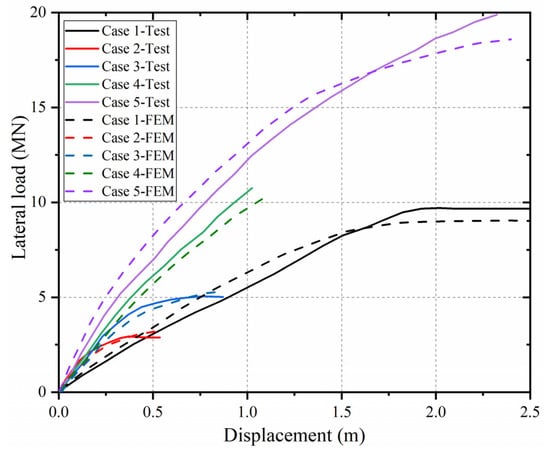The generated numerical model is validated using the lateral load-displacement curves that are obtained from the centrifuge tests [27]. (Case 1: Dw/L = 0.5, V = 5.3 MN; Case 2: wheel only, V = 5.9 MN; Case 3: wheel only, V = 12.7 MN; Case 4: Dw/L = 0.5, V = 6.4 MN; Case 5: Dw/L = 0.5, V = 13.2 MN, where the other parameters are: Dp = 3.33 m, e/Dp = 9, Ts/L = 1; Group I, Table 1). As shown in Figure 3, reasonably close agreements can be found between the results obtained from finite element method (FEM) and the centrifuge tests. We can therefore be confident that the above developed numerical modeling method could reasonably closely replicate the bearing behavior of the composite foundation in sand-overlying-clay deposit.