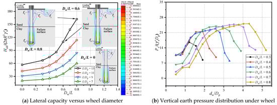Figure 4b shows the vertical passive earth pressure distribution under the wheel through presenting the normalized passive pressure (Pv/(γ′sDp)) versus normalized distance to the wheel center (dw/Dp) relationship. It is evident that the overall distribution of the vertical passive earth pressure is similar for the foundation with different wheel diameters, which indicates an increasing trend as the distance develops towards the wheel edge with the maximum value at about 0.75 Dw. It can be explained that the right intersection soil area between the pile and the wheel experiences soil densification due to the compression of the pile and the wheel, which generates a higher soil resistance vertically. The total vertical passive resistance generated under the wheel increases as the wheel diameter increases, which provides a larger bearing area.