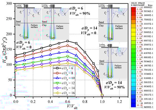Numerical modeling is carried out to examine the effect of the pre-vertical load and the lateral loading height, where the foundation geometry and the soil properties are listed in Group III of Table 1. The relationship of the normalized lateral bearing capacity and the pre-vertical load is plotted in Figure 5. It can be found that, with Dw/L = 0.6, the maximum lateral bearing capacity of the composite foundation occurs when V/Vult = 60% for different lateral loading heights. It can be concluded that the lateral loading height has little influence on the shape of the failure envelopes but only alter asymptotes.