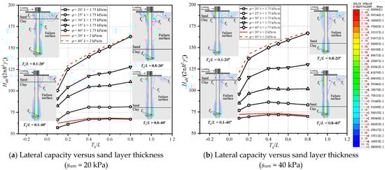 To study the effect of the soil layer thickness and the soil properties, a group of numerical analyses is conducted with Ts/L = 0.1~0.8, sum = 20 kPa and 40 kPa and k = 1.75 and 2 kPa/m (Group IV, Table 1). The influences of the internal friction angle on sand (φ) and Ts/L are presented in Figure 6, where the normalized lateral bearing capacity is plotted against Ts/L with different φ and sum. It can be found that the lateral bearing capacity of the composite foundation increases nonlinearly as Ts/L increases. The increasing trend becomes more evident with a greater value of φ, which is partly due to the P-Δ effect. From the failure mechanism of the composite foundation depicted in Figure 6a,b, it can be seen that, when Ts/L = 0.1 and φ = 20°, a “punching-through” failure pattern is developed in region (f1), which includes a rigid block near the pile beneath the footing, a passive wedge at lower right of the wheel in the sand layer, and a fan in the lower clay layer. Similar conclusions are also reported by Zheng et al. (2018) [23] in their investigation of the failure mechanism of the strip footing in sand-over-clay soil deposit. In addition, more evident plastic strain areas (f2) and (f3) at the interface of the two soil layers and the plastic strain areas (f4) under the wheel are captured when Ts/L = 0.1 and φ = 20° as compared to that of φ = 40°. When Ts/L increases to 0.8, a significant plastic strain area (f4) can be seen on the lower left region of the wheel when φ = 20°. Generally, increasing sum can significantly enhance the bearing capacity of the composite foundation when Ts/L is relatively small, while soil strength gradient k has limited influence on the bearing capacity, which can be concluded by the Hult/(2πR3γ′s)-Ts/L curves and the failure mechanisms.