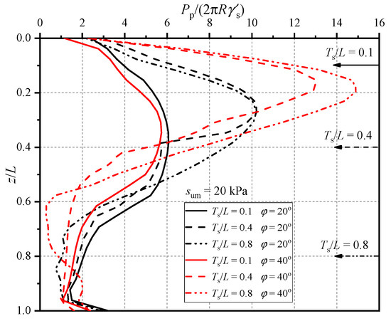 Figure 7 demonstrates the lateral earth pressure distributions along the right side of the pile body under different Ts/L and φ by plotting normalized lateral earth pressure Pp/(2πRγ′s) versus depth below the mudline z/Dp. In terms of Ts/L = 0.1, there are no obvious differences between the earth pressure distributions when φ = 20° and 40°, with the same depth of maximum earth pressure zmax = 0.4 L, which is in accordance with the case when the composite foundation is in pure clay [32]. Besides that, no abrupt change is captured at Ts/L = 0.1, and it indicates that the bearing capacity is mainly controlled by the combined wheel rather than the soil resistance provided by the pile. For Ts/L = 0.4, the overall earth pressure distribution is significantly different from that of Ts/L = 0.1, with its zmax elevate to above 0.3 L. Apparently, a sharp decrease of soil resistance can be found at Ts/L = 0.4 as the depth descends. In addition, the depth of the maximum earth pressure raises with larger φ (φ = 20°: zmax/L = 0.28; φ = 40°: zmax/L = 0.19). As Ts/L increases from 0.4 to 0.8, for φ = 20°, the earth pressure along pile barely changes, while it experiences an obvious increase within the range of z/L = 0~0.55 when φ = 40°, which is consistent with the phenomenon shown in Figure 6.