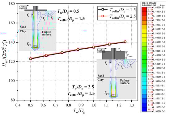 To explore the effect of wheel thickness Tw and the height of collar Tcollar, a group of analyses was conducted (Group V, Table 1). Figure 8 illustrates the relationship between ultimate lateral bearing capacities and normalized wheel thickness Tw/Dp with different Tcollar/Dp. It shows that Tcollar has a negligible influence on the capacity of composite system. As Tw/Dp changes from 0.5 to 1.25, the bearing capacity increases linearly by about 17%. This is because that additional vertical pressure is applied to the soil underneath the wheel when Tw is greater, and it can be validated by the plastic strain distribution displayed in Figure 8, which is similar to the situation in Figure 5 when vertical load is applied to the composite system. In addition, with the aim of cost-efficiency in the manufacture and installation of the composite foundation, a friction wheel with a greater thickness would not be suitable for the application of this type of foundation. Therefore, based on the above analysis, it can be confirmed that the Tw/Dp and Tcollar/Dp have minimal influences on the bearing capacity.