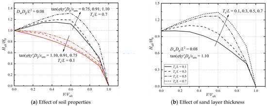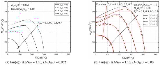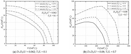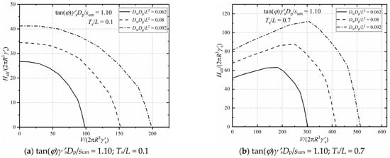 Parametric studies are carried out to quantify the influences of the soil properties (tan(φ)γ′sDp/sum), sand layer thickness (Ts/L) and foundation geometry (DwDp/L2) on the bearing capacity under combined V-H-M loadings. Figure 9 presents the influence of soil properties on the bearing capacities in the V-H-M domain by plotting failure envelopes with varying tan(φ)γ′sDp/sum. (DwDp/L2 = 0.062 and 0.08, Ts/L = 0.1 and 0.7, e/Dp = 15). Figure 9a shows that, the shape and value of failure envelopes are both related to the soil properties. From Figure 9b, it can be observed that the peak lateral capacity increases at an accelerating rate with the increase of tan(φ)γ′sDp/sum. Figure 10 shows the effect of the foundation geometry on the failure envelops in the V-H-M domain. The failure envelopes expand with the increase of DwDp/L2 under a constant upper sand thickness, which means the foundation geometry has little influence on the failure mechanism but affects the magnitude of the bearing capacity of the composite foundation. As can be seen in Figure 11, when Ts/L = 0.1, under a constant DwDp/L2, the lateral bearing capacity decreases continuously when the vertical load increases. However, as Ts/L exceeds 0.1, the peak bearing capacity can be observed in the failure envelopes. The normalized vertical load corresponding to the peak value grows as the thickness of the upper sand layer increases. For instance, it increases from 50 to 180 as Ts/L increases from 0.3 to 0.7 when DwDp/L2 = 0.062. This is because a thin layer of top sand may result in a different failure pattern like the “punch-through” failure under the combined V-H-M capacities.