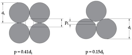 where pi is the pore diameter associated with particle size fraction i of a soil, and di is the mean diameter of the particles in size fraction i. The rationale behind Equation (1) estimating the pore diameter being 30% of the particle diameter is based on research of pore sizes between sand sized spherical particles of a uniform or similar size. It was found that particles tended to pack most commonly as shown in Figure 1, surrounded by either four (left) or six (right) other particles [22].