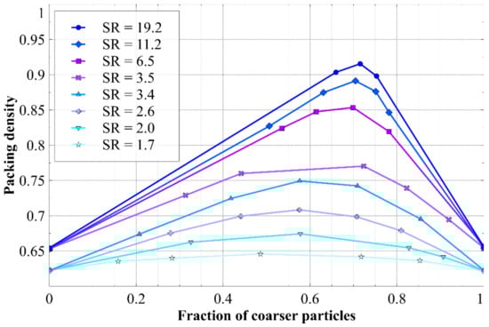 Packing density measured for binary mixtures of spherical particles, showing the effect of size ratio (SR) and the fraction of coarser particles. Data adapted from [25].