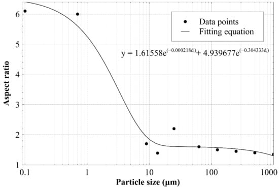 Figure 5 shows data derived from [31,47,48,49,50,51] which can be used as a basis to correlate AR to particle size. In the proposed model, the sizes of the particles in each size fraction of the GSD (di), smaller than sands (<60 μm), are adjusted by factoring them by an aspect ratio (ARi), determined by the function fitted to the data in Figure 5, according to Equation (2).