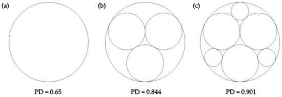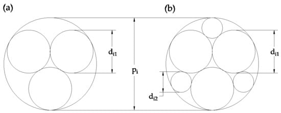 The next step in determining the grain packing arrangement is to fill the primary pores pi with smaller particles, when appropriate. This filling is carried out according to the Apollonian gasket described in Section 2.1. An Apollonian gasket is a fractal pattern where each fractal step (denoted j herein) places a number of circular particles (denoted dij) neatly into the largest pores remaining after the previous step. As a fractal, it repeats infinitely, however this model arbitrarily uses a partial Apollonian gasket where a limited number of fractal steps are taken resulting in a maximum of six particles placed into pore pi, as shown in Figure 6. Figure 6a shows the packing outcome of the first fractal step (j = 1) which places particles di1, and Figure 6b shows the packing outcome of the second fractal step (j = 2) which places particles di2. The mathematics to determine the geometry of Figure 6, based on Descartes’ theorem, is well documented [52,53,54,55] and will not be repeated here for conciseness.