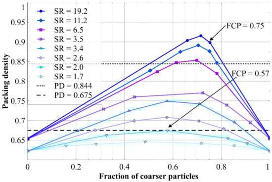 Packing density measured for binary mixtures of spherical particles, showing the effect of size ratio (SR) and the fraction of coarser particles. The horizontal lines show the packing density (PD) of states (b) and (c) from Figure 7. The maximum FCP values that could accommodate these PD values are indicated. Data adapted from [25].