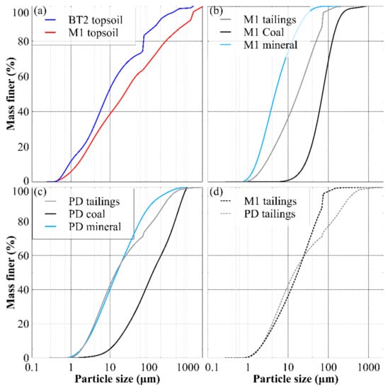 Implementing this option will require significant topsoil improvement, due to generally poor quality topsoil for plant growth in the Hunter Valley [1,2], and the further degradation in topsoil quality that occurs when land is mined and then rehabilitated [3,4,5,6]. Soil improvement at the large scales of mine sites has a high cost, leading to some research on use of waste materials, such as municipal wastes (compost and sewerage wastes), as more cost-effective topsoil improvements [7]. This study investigates an alternative option to mix a locally-derived mine waste material, coal mine tailings, with the available site topsoil to achieve improved plant growth potential of the soil mixture compared to the unaltered topsoil. Coal tailings are produced during the beneficiation process of coal, which, importantly, do not typically contain chemical species that are toxic to plants. These tailings are a fine grained waste product of high initial water content comprising mineral soil particles and coal, with the coal content up to 40% or greater [8,9]. Indeed, the fine particle size and high initial water content of these tailings materials make them problematic for conventional disposal in tailings impoundments, making the soil improvement disposal option all the more advantageous.