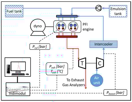 A sketch of the engine test bench is shown in Figure 1. An air-handling unit constantly supplies intake air to the engine compressor at a temperature of 293 K.