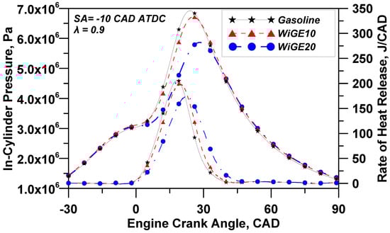 In-cylinder pressure trace and rate of heat release at SA = −10 CAD ATDC, λ = 0.9.