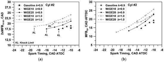 Combustion duration (2xMFB10-50) (a) and combustion center (MFB50) (b) against spark timing and relative air-to-fuel ratio for WiGE 10 and WiGE 20.
