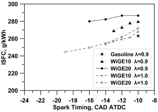 The Indicated Specific Fuel Consumption (ISFC) for all the investigated WiGE fuels, spark timings and relative air-to-fuel ratio is shown in Figure 5. It is worth pointing out that fuel consumption is estimated by considering only the gasoline content of WiGEs, as the water is inert.