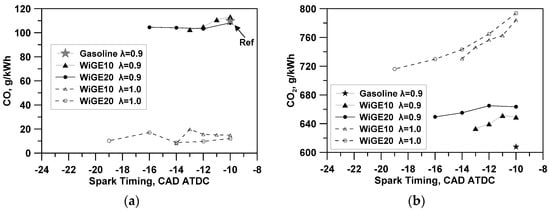 Figure 4 shows the trend of TIT against spark timing and relative air-to-fuel ratio. As shown, at a reference spark timing of −10 CAD ATDC, the turbine inlet temperature is almost the same for gasoline and WiGE in rich mixture condition. Of course, the rich A/F mixture at the reference point was selected in the manufacturer calibration to avoid, with a certain safety margin, the knock onset and the excessive thermal stress to the turbine. On the other hand, in the case of the engine mounted on the test bench, a lower heat transfer can be realized for the turbine compared to the case of an engine on the real vehicle. Based on this consideration, even if the allowable maximum TIT is 950 °C, a target of 819 °C, which is representative of the gasoline reference condition, was set for WiGE. In light of the above discussion, the criterion followed for the engine tests is the identification of knock-limited operations with WiGE and stoichiometric mixture realizing a TIT level equal or lower to the one achieved at the reference ECU condition and a lower ISFC. By increasing the spark advance, the earlier combustion phasing allowed by WiGE results in a significant reduction in the turbine inlet temperature, because the temperature of the in-cylinder gases is lower at the opening of the exhaust valves if the combustion takes place early in the engine cycle. The use of WiGE10 does not allow us to reach the TIT target at stoichiometric condition (TIT = 827 °C at knock limit; SA = −14 CAD ATDC), while WiGE20 resulted in a lower TIT than gasoline reference case at the two most advanced spark timing: 818 °C at SA = −16 CAD ATDC, and 804 °C at SA = −19 CAD ATDC.