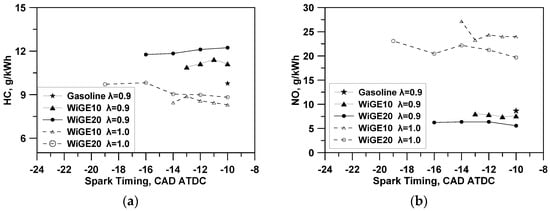 Figure 7 shows the variation of HC and NO emissions against the spark advance at the selected relative air-to-fuel ratios and for all the investigated fuels. At the rich mixture condition, the WiGE combustion produces larger HC, proportional to the water content, almost independent of the spark timing. Similarly, at stoichiometric condition, the increase in water content in the emulsion induces slightly higher unburned HC emissions. On the other hand, for a fixed water-in-gasoline emulsion, a reduction in the unburned HC is observed passing from the rich to stoichiometric A/F mixture.
