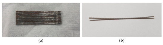 Photographic images of (a) steel and (b) polyolefin fiber. Note that the steel fiber had a hooked end shape with diameter of 0.6 mm and length of 35 mm; the polyolefin fiber had a rough textured prismatic shape (1.05 × 0.55 × 50 mm) consisting of multiple individual fibers that were twisted and combined to act as a single fiber.