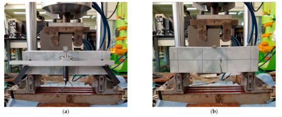Testing configuration of prismatic specimens used for the 4-point bending test; (a) before loading and (b) after termination of the test.